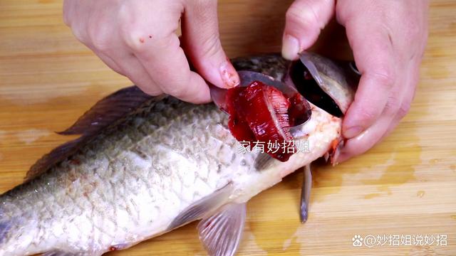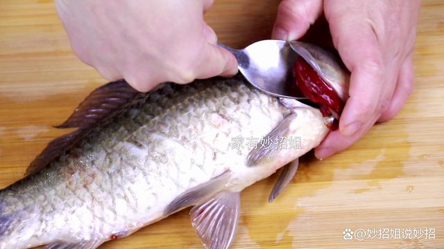2,去鱼鳃。 鱼头位置的鱼鳃,也是需要我们处理掉的地方。很多朋友处理鱼鳃,就是直接用手去掏的,但这样不仅会弄得满手脏污,而且也容易割到手。其实去鱼鳃,我们利用上一个不锈钢勺子就可以了。