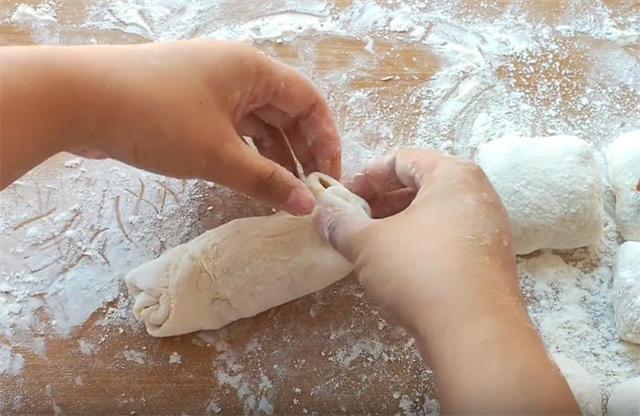 5.接下来我们边向后拉伸边卷起,卷好以后两端对折捏合,这样我们生坯就做好了。
