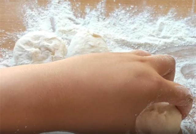 3.早起的时候,我们在案板上和面团上撒上一层干面粉,防止粘手,然后把面糊倒在案板上,利用干面粉把面糊整理成长条形,然后像这样虎口掐断,把它分成6到8份。