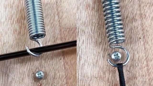 弹簧太紧拉不动怎么办?教你一招,用一根绳子让弹簧自动套进去。 在日常生活中,我们经常会遇到弹簧过紧难以拉动的情况,这时候大家通常会尝试用螺丝刀来辅助。然而,实际操作中我们往往会发现,使用螺丝刀的效果并不明显,甚至有时会感到非常吃力。举个例子,现在我们正试图拉动一个弹簧,可以明显感觉到它非常紧,即使借助螺丝刀也难以将其拉动。面对这样的困境,我们应该如何处理呢?