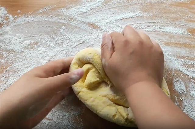 3.接下来我们在案板上撒一些干面粉,再加入约1.5克的小苏打揉搓排气,然后把发好的面团与干面粉和小苏打一起揉,一定要多揉一会儿,尽量把它揉均匀。