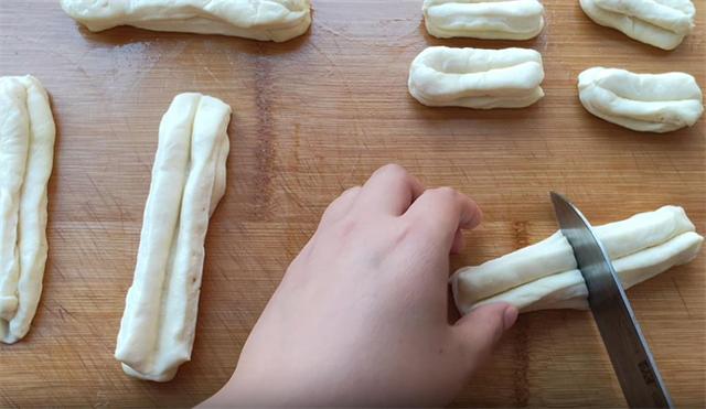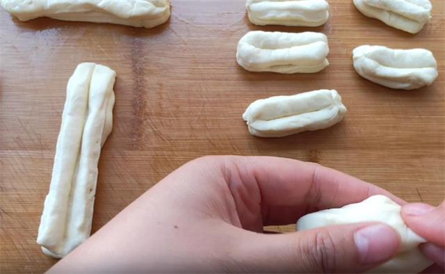 3.将面团切成宽条,两条相叠,用筷子轻压,再从中间切一刀,这样小油条生坯就做好了,每根小油条两端需手工捏合,防止炸制时裂开,同时形成密闭空间,使内部在预热后更加蓬松。