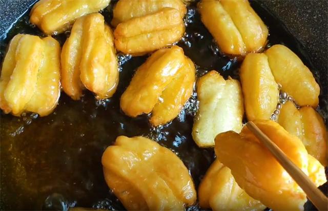 5.用酵母做油条的第二个关键点就是油温,三至四成热最为理想,既能避免表皮急速焦化,又能确保酵母活跃,使油条外酥内软,反复翻面炸4-5分钟,表皮金黄出锅。