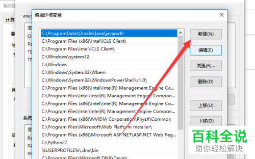 5. 进入编辑环境变量的窗口中,点击右上方的新建按钮,