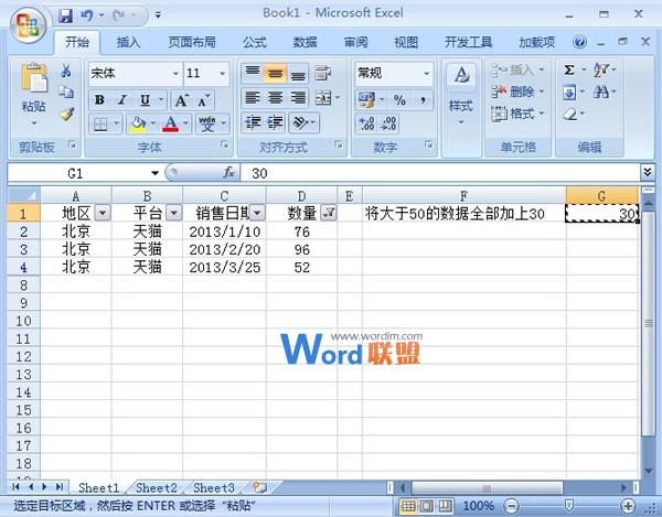 ④筛选完毕,然后在G1单元格输入30,复制下来。