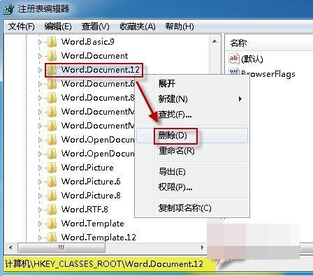 对于 Word 2007/Word 2010,请找到以下三个键值。(然后分别右击选择“导出”,把键值备份至桌面。一旦发生问题,可以通过备份来恢复注册表键值)HKEY_CLASSES_ROOT\.docxKEY_CLASSES_ROOT\Word.Document.12HKEY_CURRENT_USER\Software\Microsoft\Windows\CurrentVersion\Explorer\FileExts\.docx之后再分别右击这三个键值并删除。