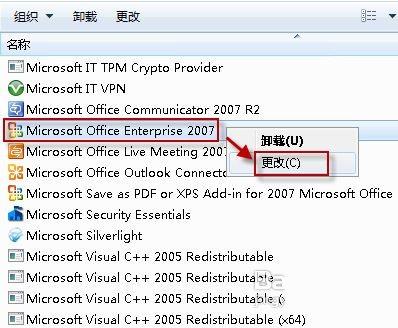 右击 Microsoft Office 2007/2010,选择“更改”。(对于 Microsoft Office 2003 的操作与此类似)