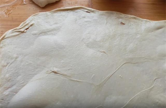 4.案板抹油,先把面剂用手推开,然后像这样向各个方向把面皮抻成半透明状,抻到这种程度,才能保证做出来的饼层次薄如纸。