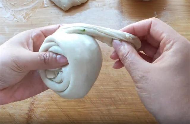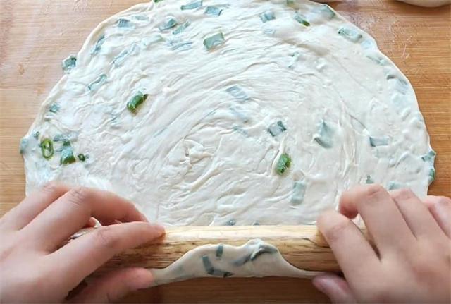 5.然后均匀的涂抹油酥,撒葱花,然后从一端拎起,稍微摔打,把它从左向右盘起,这样饼的生坯就做好了。