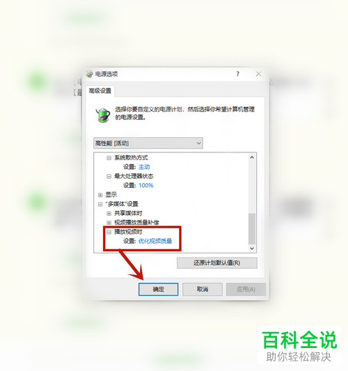 7.找到【处理器电源管理】栏下的 【最小处理器状态】,将其设置为100%。再将【系统散热方式】设置为“主动”,将【最大处理器状态】设置为100%,找到【多媒体设置】栏下的 【播放视频时】,将其设置为【优化视频质量】。全部设置好之后我们点击确定选项即可,