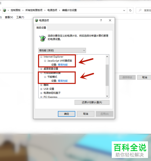 6. 点击之后即可打开【电源选项】窗口,我们将【Internet Explorer】和【无线适配器】更改为【最高性能】。