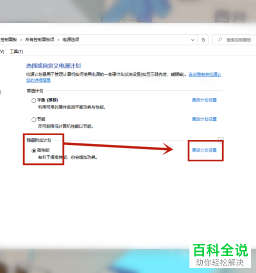 4. 在打开的界面中我们将【隐藏附加计划】栏下的 【高性能】勾选起来,之后再点击【更改计划设置】选项。