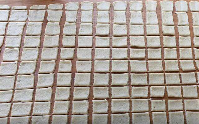 4.然后在案板上抹油,把揉好的面团放在案板上,擀成长方形的大薄片,厚度约为3毫米左右,然后用刀把它划成1.5厘米见方的小块。