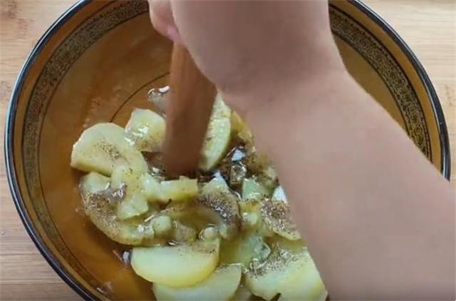2.然后我们加入适量的盐、黑胡椒粉,加入约15到20毫升的食用油,按压成细腻的土豆泥。