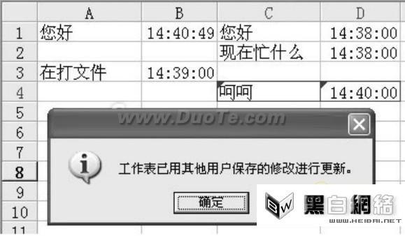 小提示 提高效率,多人同时录入一个Excel文件这个应用主要利用了Excel的“允许多用户同时编辑,同时允许工作簿合并”功能,在实际工作中,可以用做多人共同录入一个Excel表格,Excel会自动保持信息不断更新。比如:有A、B、C、D四个用户分工合作共同完成2005.xls文件的录入,首先打开这个文件,并按上面的操作勾选“允许多用户同时编辑,同时允许工作簿合并”,最后点击“文件→另存为”,将其保存在E电脑的D盘中。接下来四个用户就可以同时在这个文件中录入了。 |