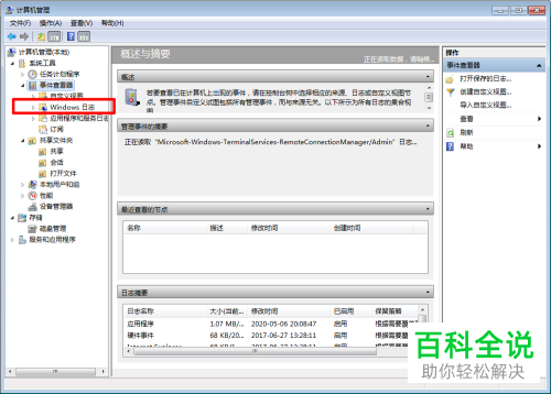 5. 如图,在展开的菜单中,点击Windows 日志选项,如图,就会打开系统的日志,选择一个想要查看的日志。