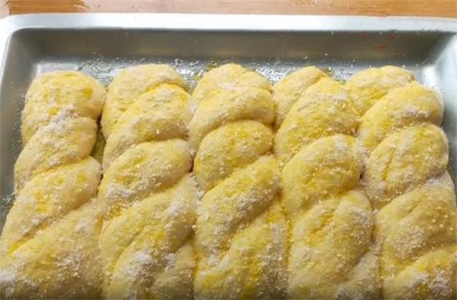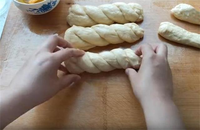 5.我们像这种反复揉搓在对折的过程,就是为了把它的面筋捋顺,这样做出来的面包才会呈拉丝状,这样口感吃起来才会既松软又有筋道,把松弛好的面条像这样交叉卷起,生坯做好以后,盖上保鲜膜醒发至两倍大。