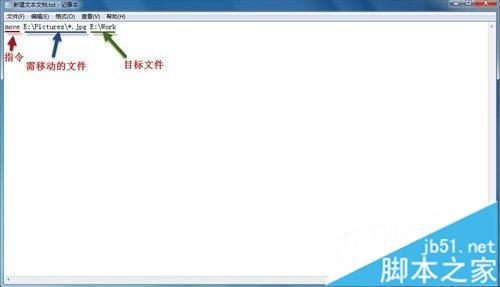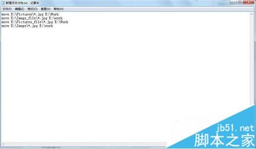 2、在文本窗口中输入”move“ 空格 需要移动的文件后缀名所在的文件夹路径 ”\*“ 需要移动的文件后缀名 空格 目标文件夹路径。例如:move E:\Pictures\*.jpg E:\Work;
