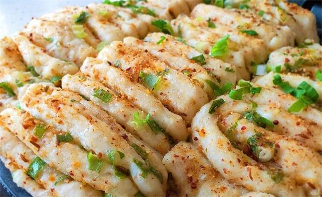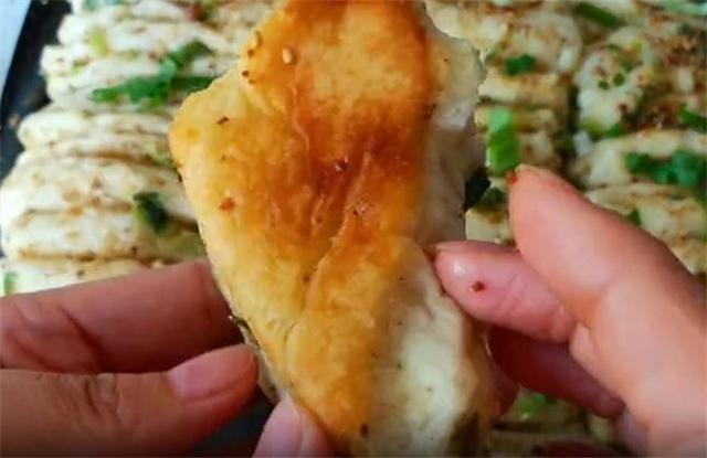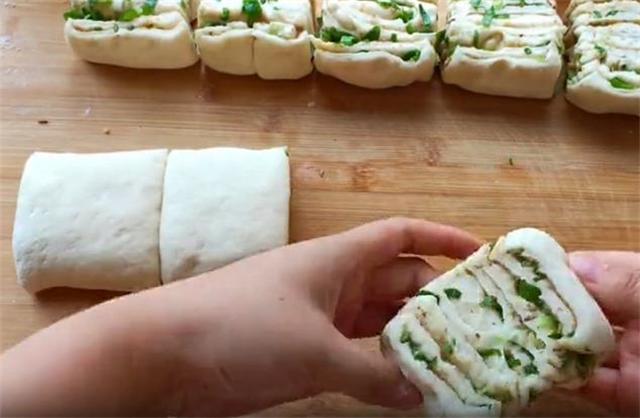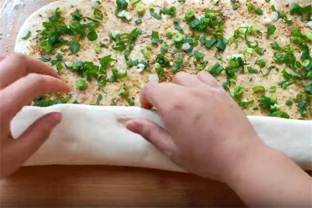 4.早起的时候我们把发好的面揉搓排气,然后把它揉成光滑的面团,揉好以后把它擀成长方形的薄片,这个厚度约3到4毫米左右。然后把准备好的油酥均匀的涂抹在面皮上,再撒上一层椒盐或者是花生碎,这样会增加风味,最后放上葱花,然后像这样折叠着把它卷起。