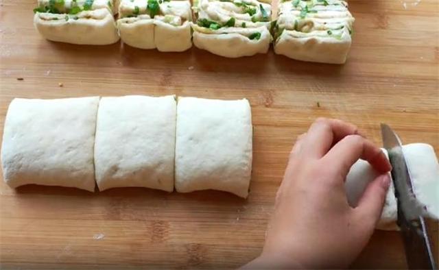 5.卷好以后,我们把它分割成8到10份左右,然后用刀把它横着切开,底部不要切断。