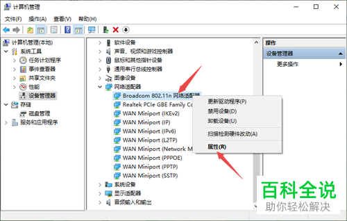 5. 第五步鼠标右键单击无线网卡设备,接着在弹出的菜单栏中根据下图箭头所指,点击【属性】选项。