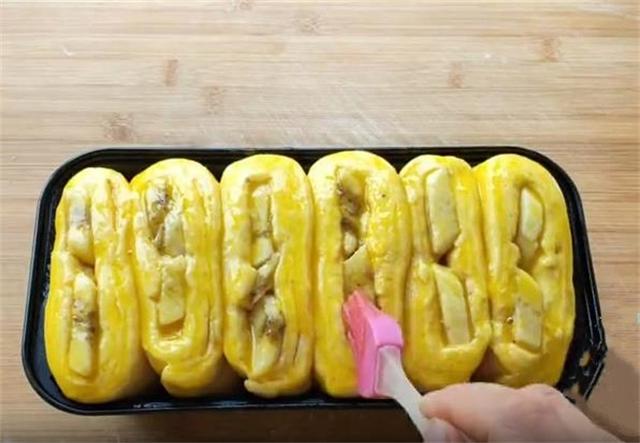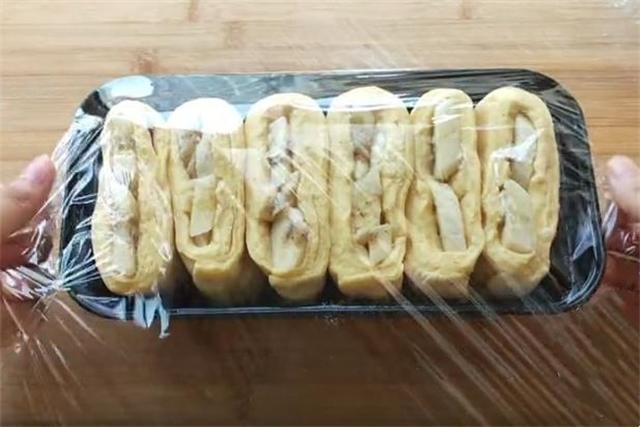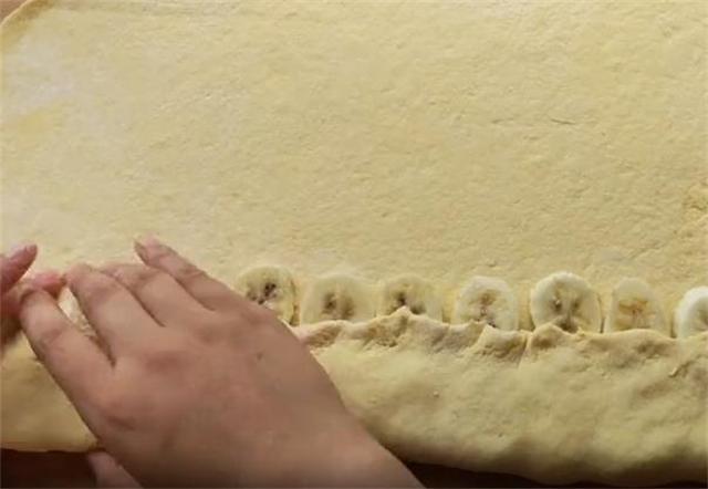 4.然后把香蕉片放在面皮上,像这样折叠卷起。