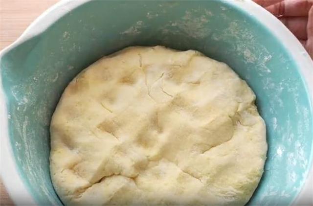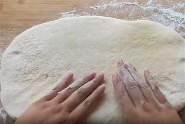 3.案板上撒一些干面粉,把发好的面放在干面粉上,然后把它揉搓排气,揉成圆面团,用擀面杖把它擀成长方形的面皮,厚度约半厘米即可。