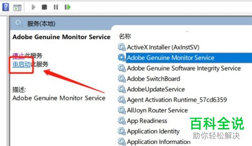 5. 最后,在打开的页面,点击左上方的【重启动】,就可以将Adobe Genuine Monitor Service重新启动了。