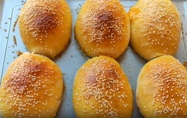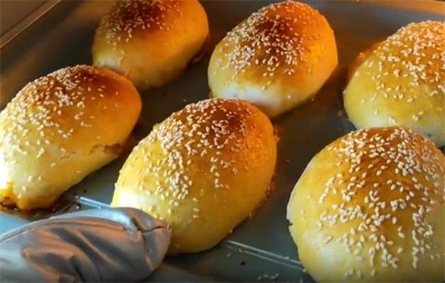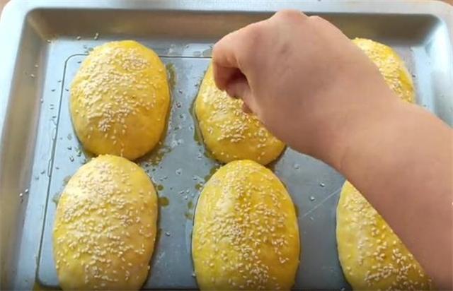 6.接下来烤盘刷油,把做好的生坯团成椭圆形,放在烤盘上,二次醒发10到15分钟,醒发至体积明显变大,我们准备一些食用油刷在表皮上,撒上白芝麻。
