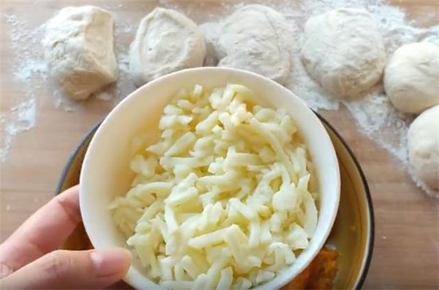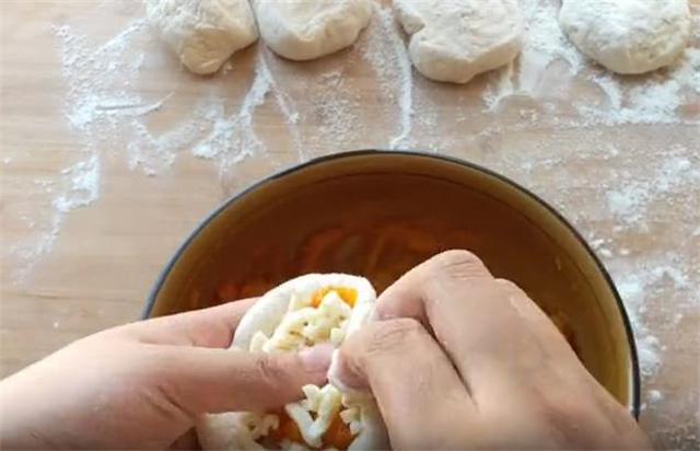 5.然后把面剂按压成薄的面饼,先放芝士碎,再放入南瓜泥,上面再盖上一层芝士碎,然后把它封口,虎口按压收紧即可。