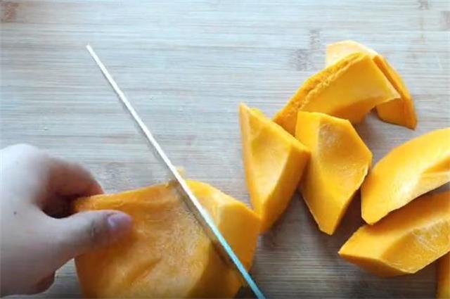 2.接下来我们准备半个南瓜,洗净去皮切成小块,上锅蒸熟备用。