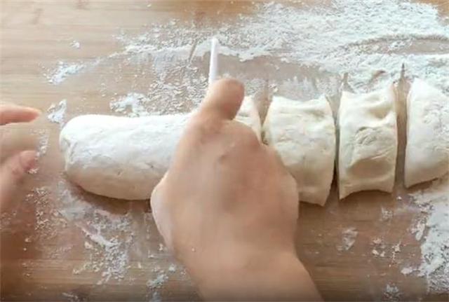 3.把发好的面放在案板上揉搓排气,然后把它搓成长条,分成6到8个面剂。