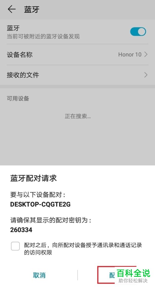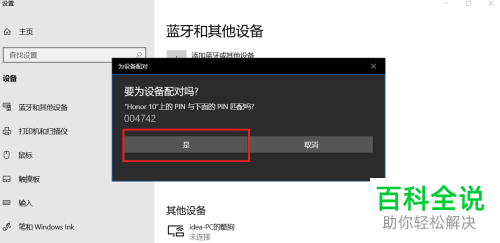 4. 选择配对之后,电脑提示确认配对提示,点击是。手机也是确认是,然后稍等,便配对成功。