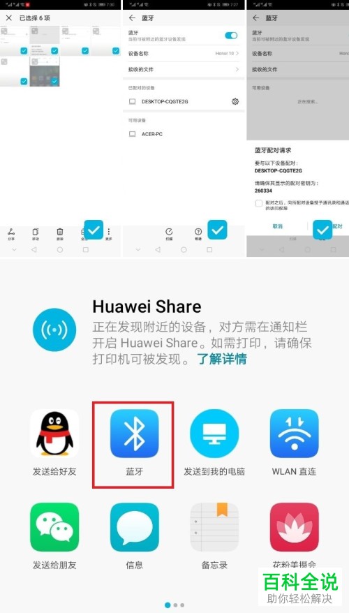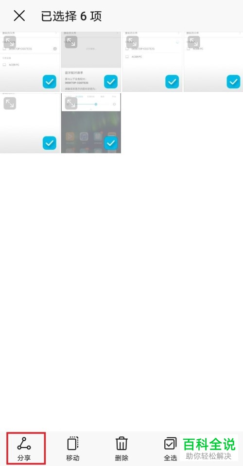 6. 在我们的手机上把需要传输的文件多选,如图我们选择传输图片,选择好图片之后,点击左下角的分享,然后选择蓝牙方式,在弹出蓝牙设置的窗口下选择配对的“我的电脑”后,电脑上就显示正在接收文件的进度条了。