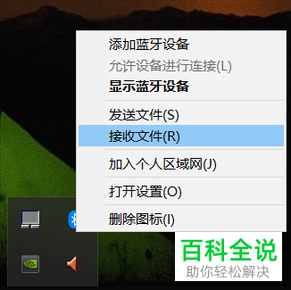 5. 接下来就开始传文件了。手机和电脑互传文件的操作基本上一样,我们就以手机向电脑传输文件为例,先在电脑任务栏上右键蓝牙图标,在菜单中选择接收文件,然后弹出接收文件的对话框,无许操作,接下来就在手机上操作完成了。