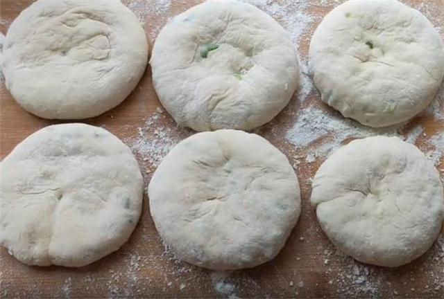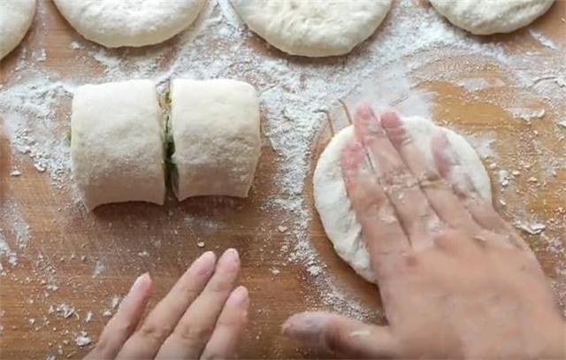 5.接下来我们把面剂像这样两端捏合,这样防止葱花露出,然后放在案板上按压平整。