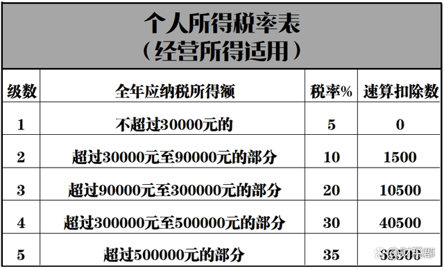 应纳税所得额=全年收入总额-成本、费用及损失 应纳税额=应纳税所得额×适用税率-速算扣除数 生产经营所得适用税率为5%——35%五级累进税率,税率表如下: