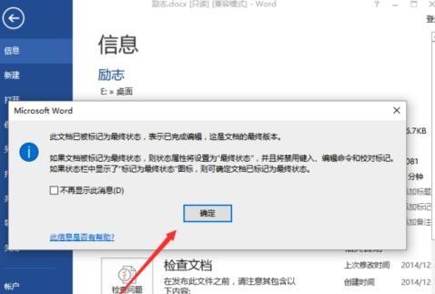 步骤五:在弹出的“此文档已经被标记为最终状态,”对话窗口中,再次点击“确定”按钮关闭对话框。如图所示;