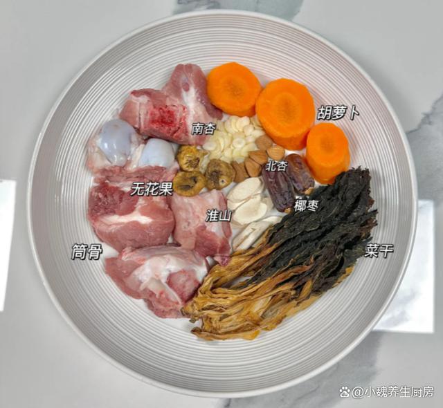 进入酷暑夏天,每天从六月份就开始升温,温度直接上升至35摄氏度以上,尤其是许多南方城市,就像“火炉”一样,地面都是滚烫的,太阳非常毒辣,白天非常闷热,出汗会比平常多,炎热的天气会带走身体里的水分和营养,这个时候身体抵抗力最差,湿毒会入侵身体,这个时候记忆力差,四肢没有力气,从而导致肥胖,胃口还特别差。天热后不仅仅需要营养,祛湿也是很关键的,祛湿不仅仅要从食疗改善,还要加强自身的运动锻炼,规律我们的作息,才能保持健康的身体。今天为小伙伴们分享一款老少皆宜的祛湿靓汤——菜干南北杏胡萝卜炖猪骨汤,比鸡汤鸭汤更受欢迎,学起来给家里人做一做吧。六月要多喝汤,鸡汤鸭汤靠边站,建议多喝这汤,赶跑体内湿气。  【菜干南北杏胡萝卜炖猪骨汤的具体做法】 挑选一些食材:选购新鲜筒子骨450克左右(筒子骨是猪骨的种类之一,里面含有大量骨髓,蛋白质和钙质,能够促进骨骼发育,补充钙质,也让营养更容易吸收,猪骨需要焯水处理,还要掌握好炖汤的火候),南北杏各20克左右,菜干50克左右(菜干又叫干菜,是新鲜的蔬菜经过晒干后而成,储存时间非常长,有独特的香味,一般搭配各种肉类一起吃,还能够拿来煲汤),胡萝卜一根,无花果几个,干淮山药少许,冷水和温水少许,生姜一大块,几勺料酒,若干食盐和胡椒粉,其他调味品。 正确做法: 1:提前准备好菜干,胡萝卜,筒子骨,南北杏和无花果等食材,先把胡萝卜要彻底洗净,记得一定要削掉萝卜皮,然后切成大小相同的块,不能切太薄了,避免煮烂了。2:菜干先用清水洗净,然后用温水泡发开,控干水分,南北杏也用冷水浸泡一会儿,无花果用温水泡发变软,放在一边备用。 3:将生姜都切成片,干淮山药和椰枣洗干净,香葱洗净打成葱结,筒子骨提前让商贩剁块,用清水多冲洗几遍,将血水和血丝冲干净。