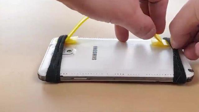 首先,你需要准备两根橡皮筋,这是制作过程中的关键道具。接下来,按照以下步骤操作:将牛奶提手平放在手机背面,确保提手能够稳固地贴附在手机上。然后,用一根橡皮筋像这样紧紧地扎过来,将提手的一端固定在手机上。接着,再用另一根橡皮筋以同样的方法捆扎住提手的另一端。