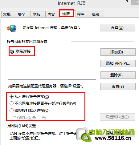 Windows 8.1如何解决弹出自动拨号窗口 Windows 8.1如何解决弹出自动拨号窗口,Windows 7和Windows 8系统开机出现弹出宽带自动拨号对话框,设置打开internet选项,选择当前宽带连接,点击从不进行拨号连接,确定即可。如下图:
