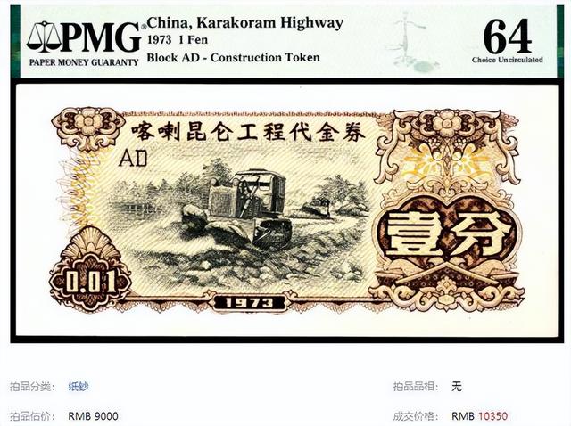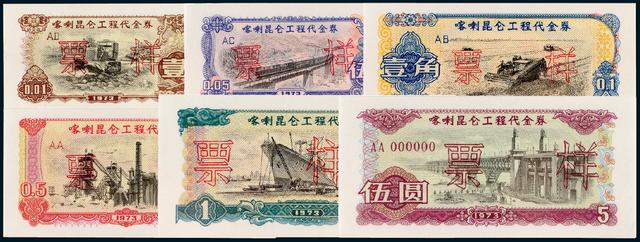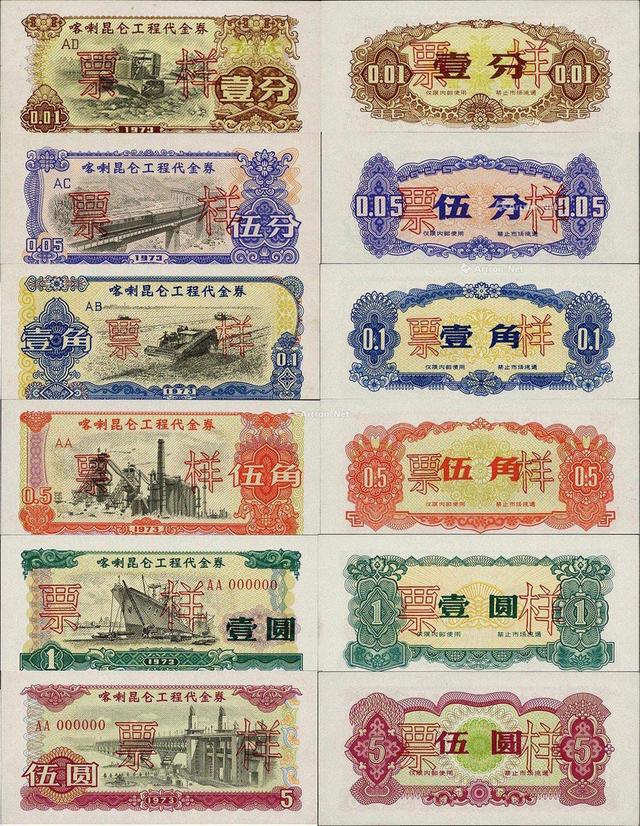 原来在上世纪60年代,我国开始进行喀喇昆仑工程,就是在中巴之间修一条公路,在73年根据上级安排,央行特意发行了一套喀喇昆仑工程代金券,整套代金券一共有6种面值,年份都是1973年,面值依次是1分,5分,1角,5角,1元和5元。
