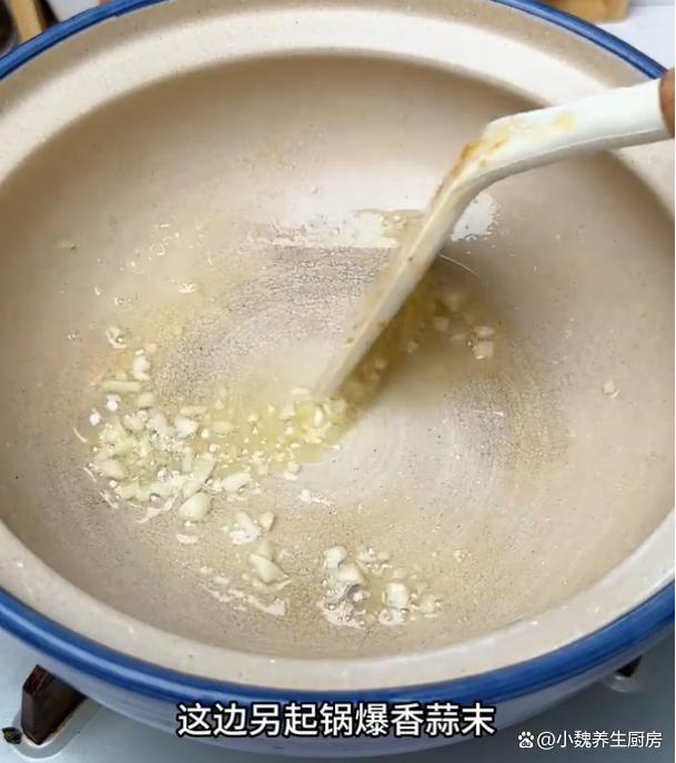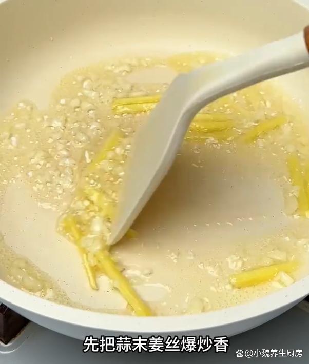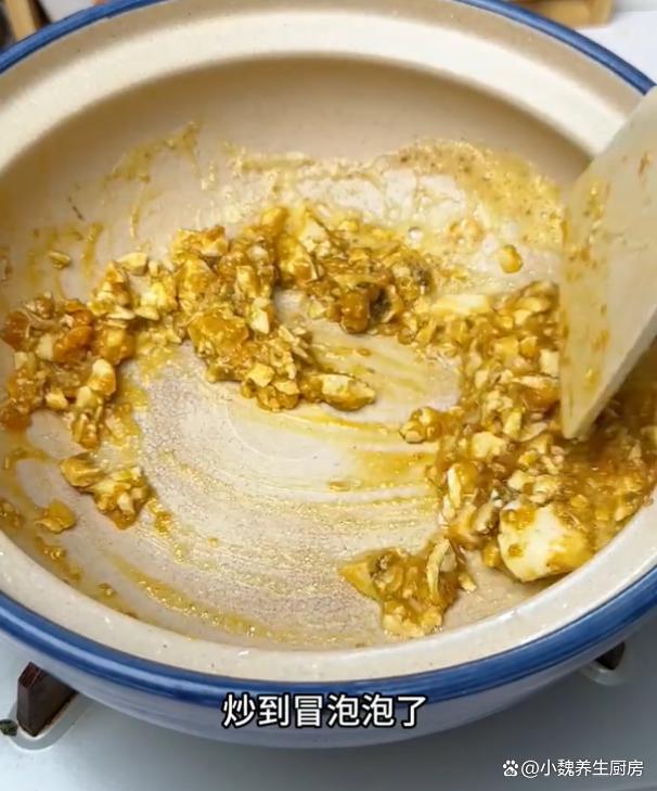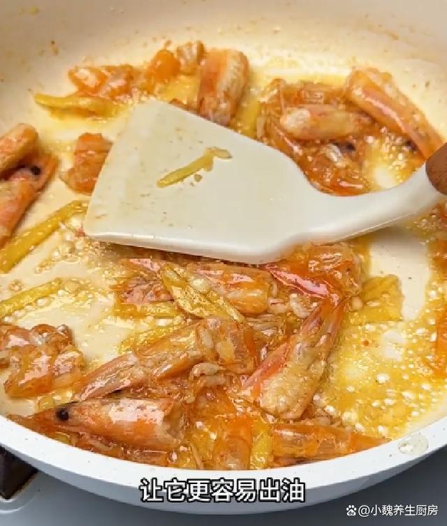 7:锅底加上食用油烧热,加上一些蒜末炒香,倒入咸蛋黄煸炒一会儿,加上虾仁煸炒至变色,倒入提前煮好的汤汁。 (www.wS46.com)