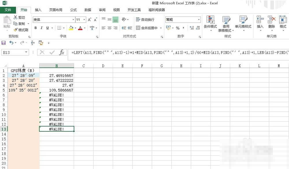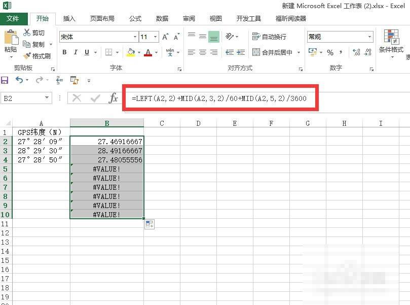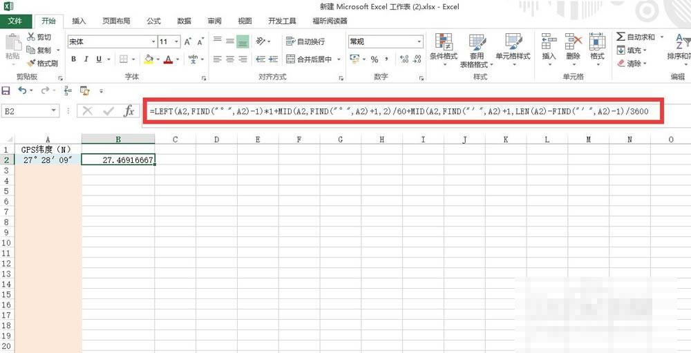 2、换算成度;在需要输入度的列输入公式:=LEFT(A2,FIND("°",A2)-1)*1 MID(A2,FIND("°",A2) 1,2)/60 MID(A2,FIND("′",A2) 1,LEN(A2)-FIND("′",A2)-1)/3600 回车即可(加黑的为度分秒所在的单元格)。