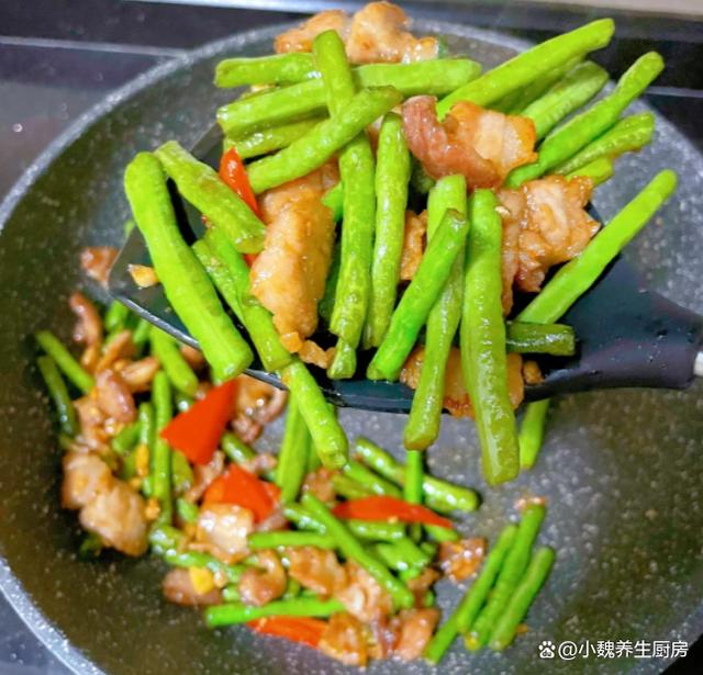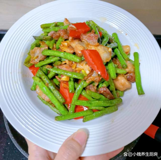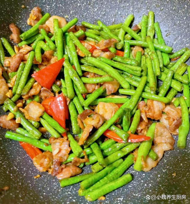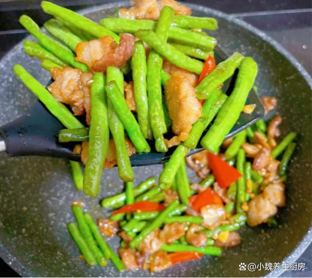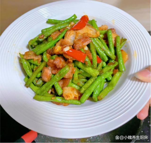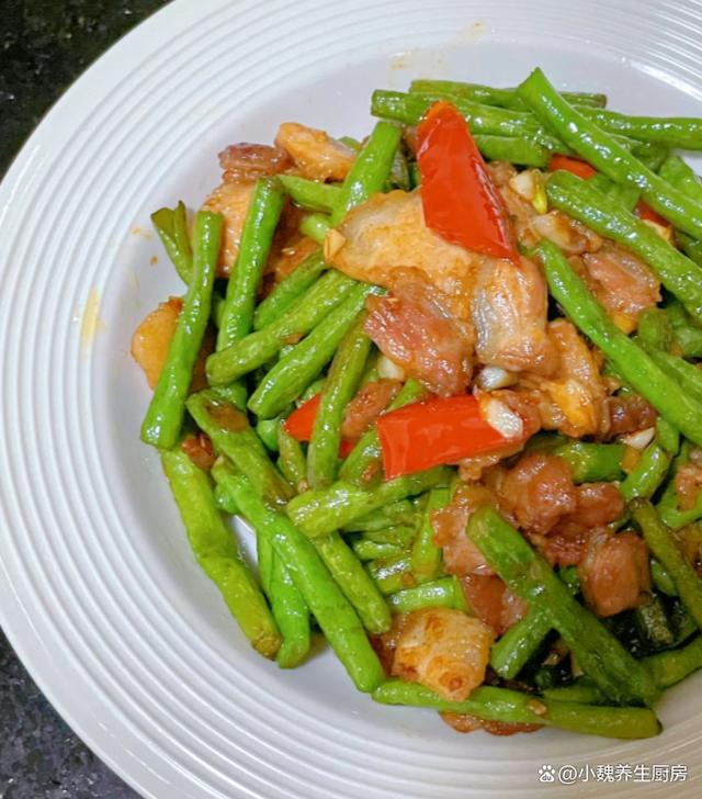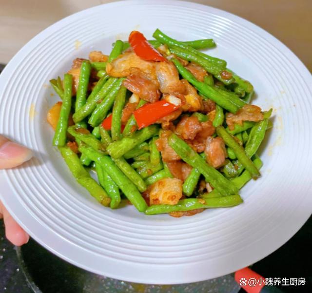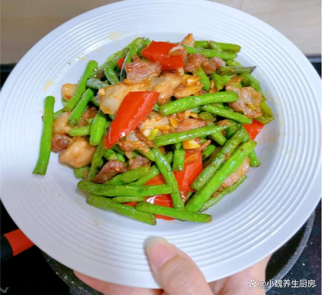 第五步:锅底再加上少许食用油,放入一些姜蒜末炒香,爆炒出香味来,倒入豆角炒至断生,放入红椒块配色。 第六步:倒入提前炒好的五花肉,加上少许白糖和食盐调味,加上生抽和蚝油少许,加上半勺鸡精,用锅铲翻炒到均匀。第七步:淋入少许清水,大火收汁,关火盛出,这道红椒豆角炒肉片就制作完成了。 红椒豆角炒肉片的制作小贴士:首先,在食材的选择上,我们要选择新鲜、优质的豆角、红椒和猪肉。豆角要挑选嫩绿、饱满的,红椒则选颜色鲜艳、质地脆嫩的,猪肉则最好选择五花肉,这样炒出来的肉片口感会更加鲜嫩多汁。 其次,处理食材时,豆角要先去掉两端的筋,然后切成段状;红椒去籽切丝,这样炒出来的红椒更入味;猪肉切成薄片,用料酒、生抽、淀粉等调料腌制一段时间,让肉片充分吸收调料的味道。在烹饪过程中,火候的掌握也至关重要。炒制豆角时,先用中火将豆角炒至断生,再放入红椒丝翻炒至断生。接着,将腌制好的肉片放入锅中,用大火快速翻炒,让肉片均匀受热,炒至肉片变色即可。最后,调味也是关键。在炒制过程中,可以根据个人口味适量加入盐、鸡精等调料,让菜肴味道更加丰富。同时,还可以加入一些蒜末或姜末,提升菜肴的香气。 总之,制作红椒豆角炒肉片需要注意食材选择、处理、火候掌握和调味等多个方面。只有掌握了这些小技巧,才能做出一盘色香味俱佳的红椒豆角炒肉片,让家人和朋友赞不绝口。你们是否吃过这道红椒豆角炒肉片吗?(上述配图都出自网络)
