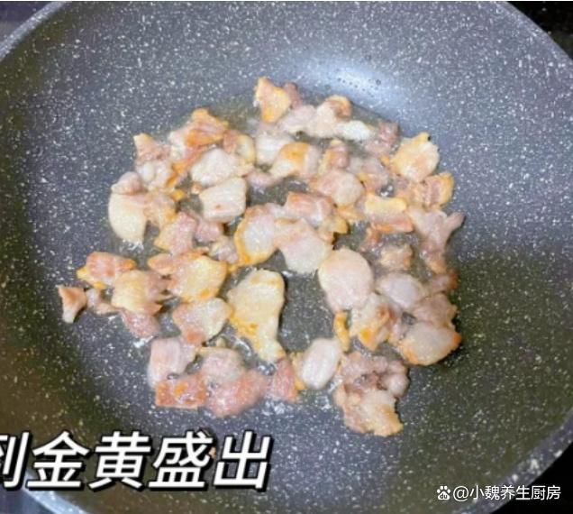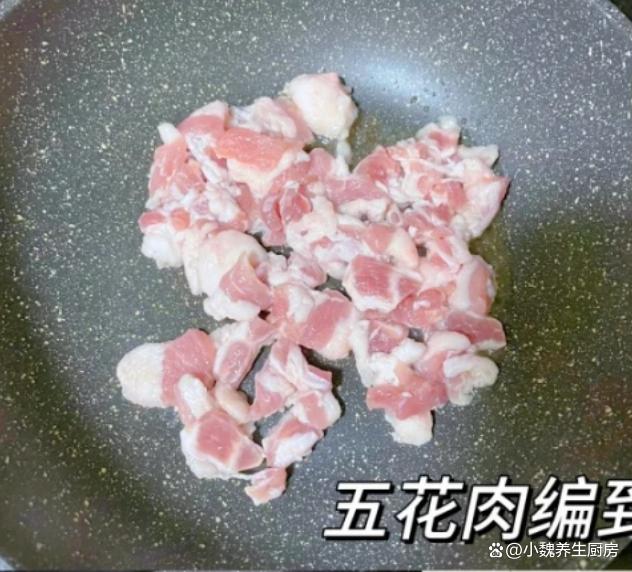 第四步:锅底烧热乎一会儿,滑入腌制好的五花肉,小火煎一会儿,煸炒出肥腻的油脂,翻炒均匀,加上半勺老抽上色,盛出备用。
