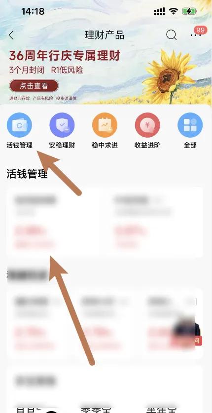2、来到理财产品页面后,我们最后点击 活钱管理,进入将活期存款转入银行卡即可。