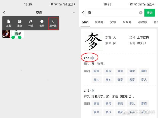 在微信中,其实还隐藏着很多非常实用的其他功能,比如认字功能,当我们在与他人聊天的过程中遇到了自己不认识的字,那么这个时候,我们长按这个字,它就会显示出一个搜一搜的功能。我们点击进入搜一搜功能后,它就会立马显示出这个字的读音以及释义,我们也就能快速了解这个字了。