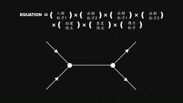 如上图所示有两个费曼图,它们显示了正在发生的事情。在左侧的费曼图中,我们看到夸克和反夸克结合在一起形成一个光子,然后衰变成电子和反物质电子。在右侧费曼图中,我们看到了同样的东西,但是光子换成了一个Z玻色子。 虽然费曼图是帮助我们可视化的图,但它们也是伪装的方程式。在这种情况下,每个图包含七个元素。有两个入射粒子和两个出射粒子,然后是发生交互的两个顶点,最后是携带粒子的力。因此,我们可以写出一个方程式,将所有这些组合在一起:它等于入射粒子1×入射粒子2×出射粒子1×出射粒子2×创造顶点×衰变顶点×携力的粒子。