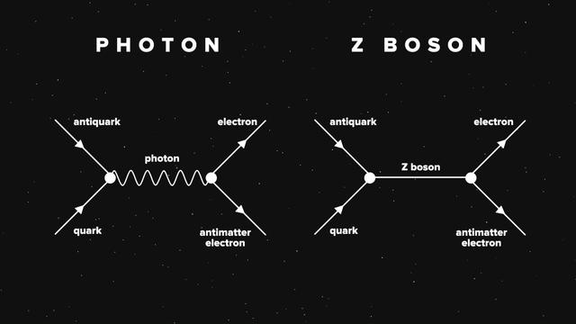 关于粒子物理学,人们可能会问很多问题,其中的一个问题是为什么三个亚原子力当中,弱力会如此弱?在质子大小的距离尺度上强力是最强的,电磁力大约是强力的百分之一,弱力的强度仅为强力的0.001%。要了解这其中发生了什么,需要先了解一些事情。 首先,光子是介导电磁力的粒子,它没有质量也不带电荷。对于弱力,有两个粒子介导相互作用:它们是W和Z玻色子。这两个粒子都非常大,W 玻色子带电荷而Z玻色子是中性的。但是,为了更简单的说明,我们只比较光子和Z玻色子,但最后的结果具有普遍性。为此,我将描述一个具体示例:夸克和反夸克聚集在一起并湮灭成一个携带力的粒子,然后衰变成一个电子和反电子。